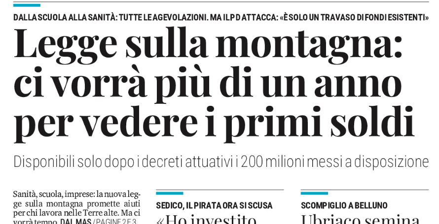 Legge sulla montagna, almeno un anno per i primi soldi. La rassegna di venerdì 12 settembre ►VIDEO