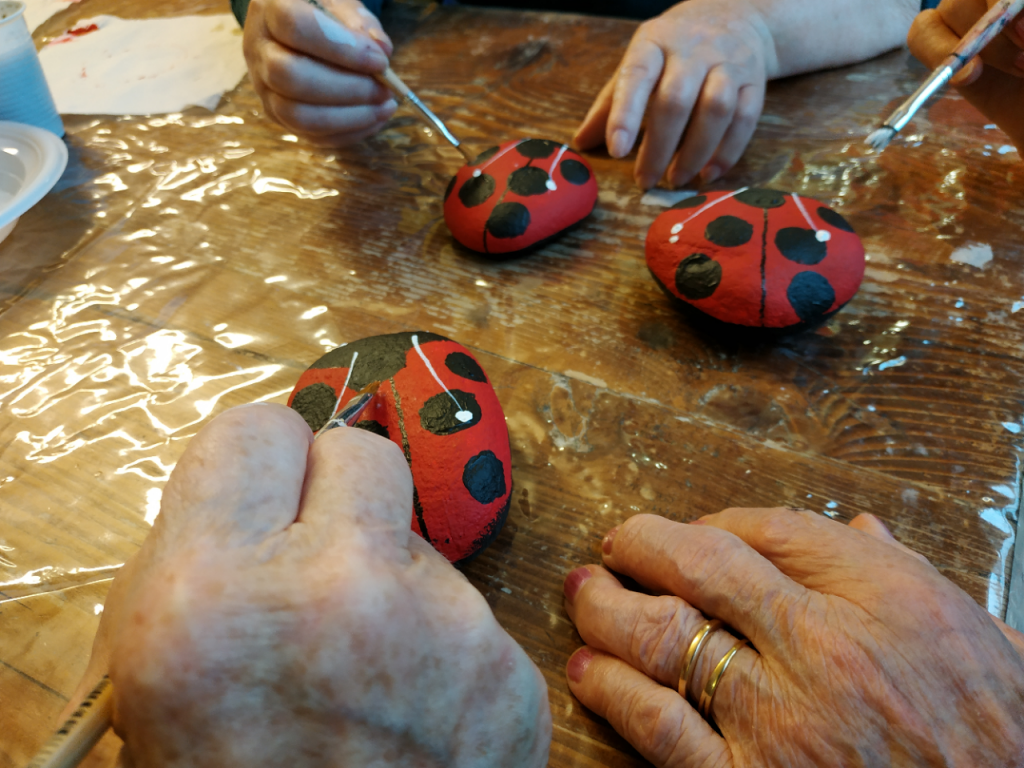 Alcuni anziani residenti, coordinati dall’artista stessa, si sono cimentati nella creazione di una coccinella dipinta su sasso.
